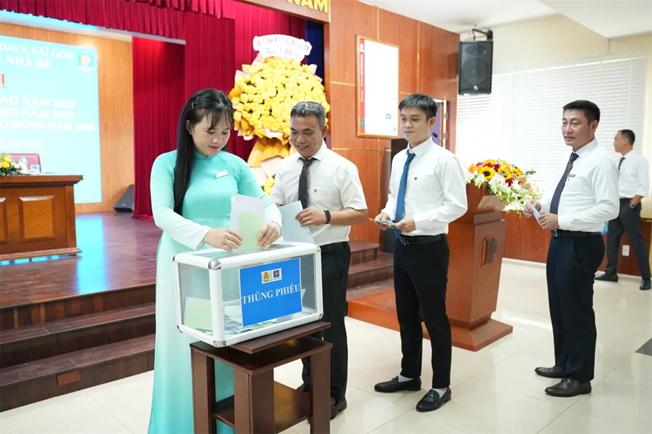 Delegates cast votes to elect delegates to the Petrolimex Saigon Employees’ Conference and the Nha Be Petroleum Terminal People’s Inspection Committee for the 2026–2028 term.