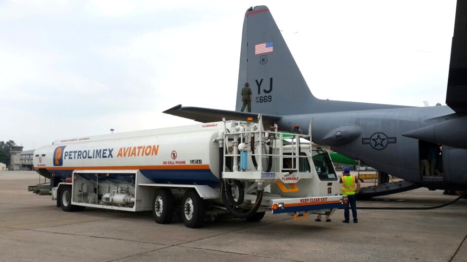 Petrolimex Aviation refueling Lockheed C-130 Hercules of the US Air Force at Noi Bai International Airport