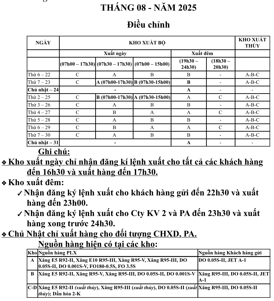 Lịch kho xuất hàng Tháng 8/2025 (điều chỉnh 22/8/2025)