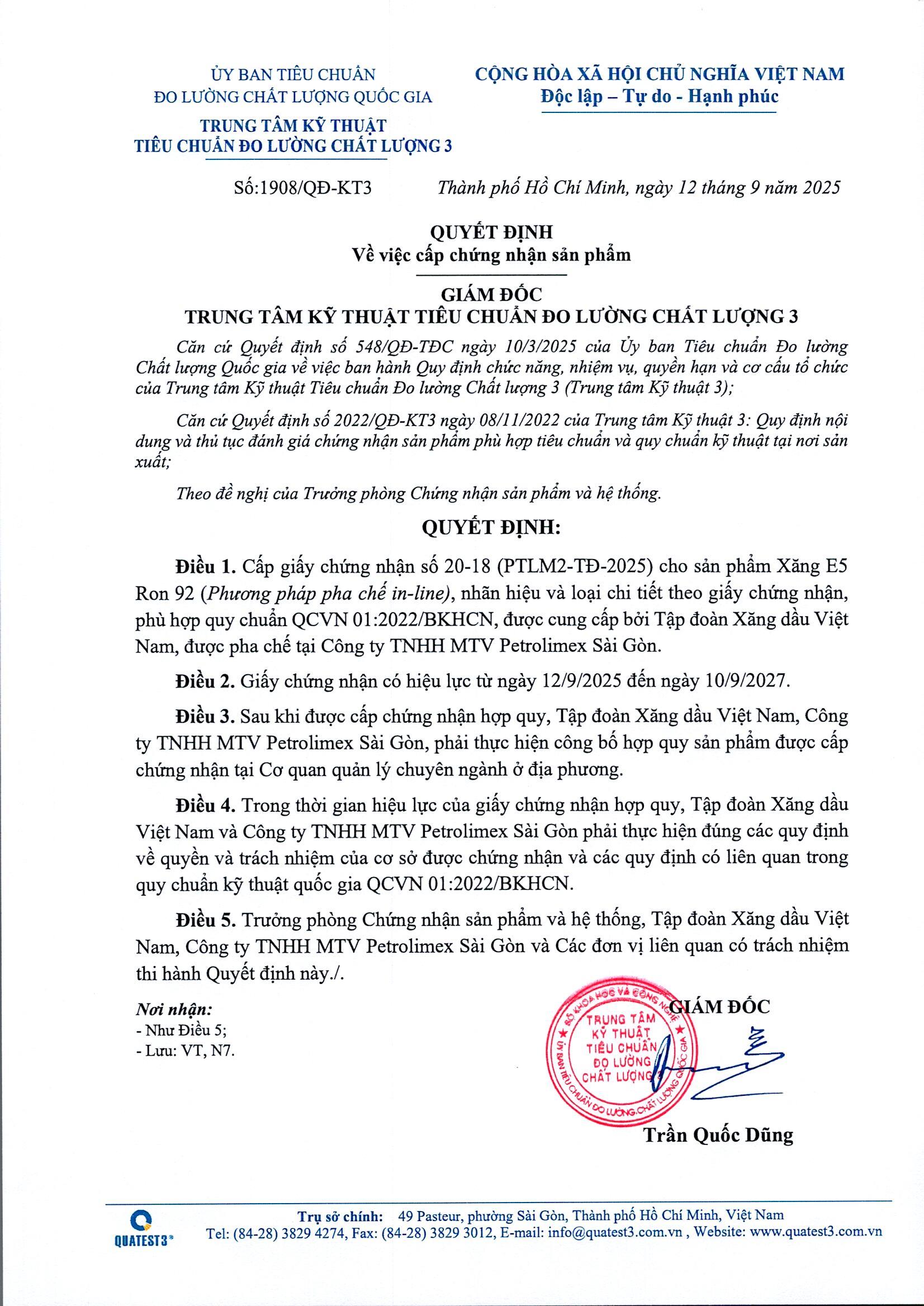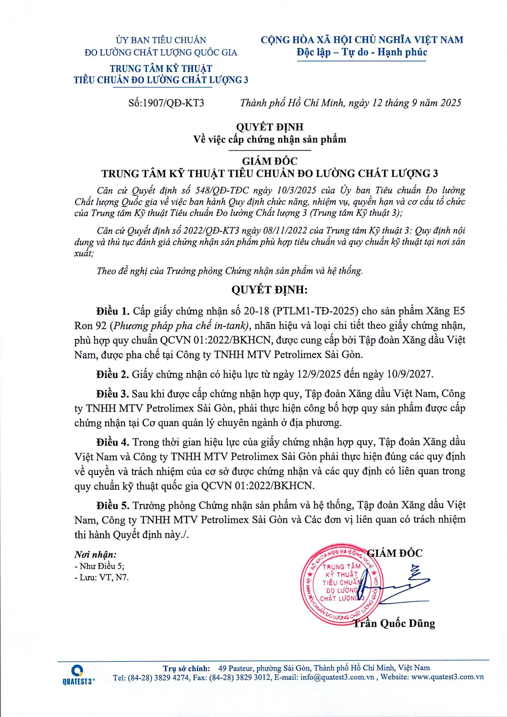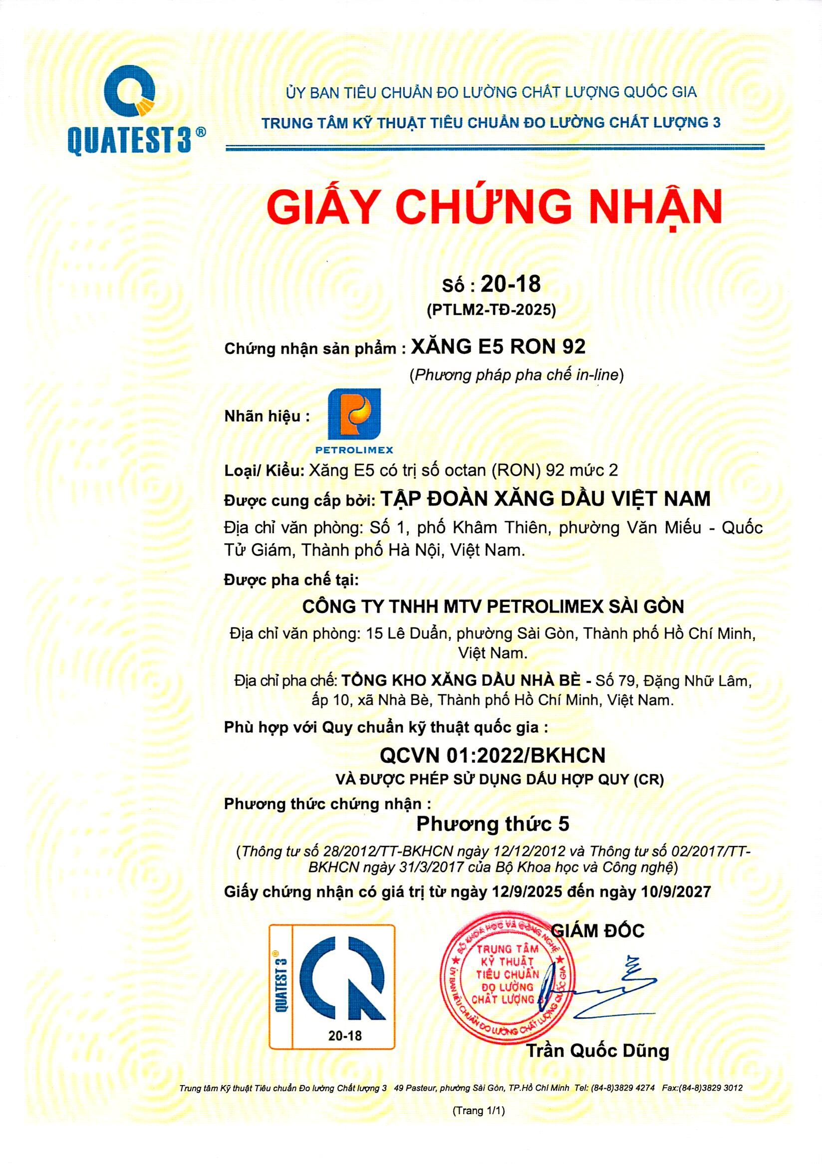 Tháng 9/2025, Trung tâm kỹ thuật tiêu chuẩn đo lường chất lượng 3 (Quatest 3) đánh giá và cấp lại Giấy chứng nhận sản phẩm Xăng E5 RON 92 - II (phương pháp pha chế In-Tank) theo phương thức 5 phù hợp Quy chuẩn kỹ thuật QCVN 01:2022/BKHCN và được phép sử dụng dấu hợp quy (CR), hiệu lực chứng nhận từ ngày 12/9/2025 đến ngày 10/9/2027.