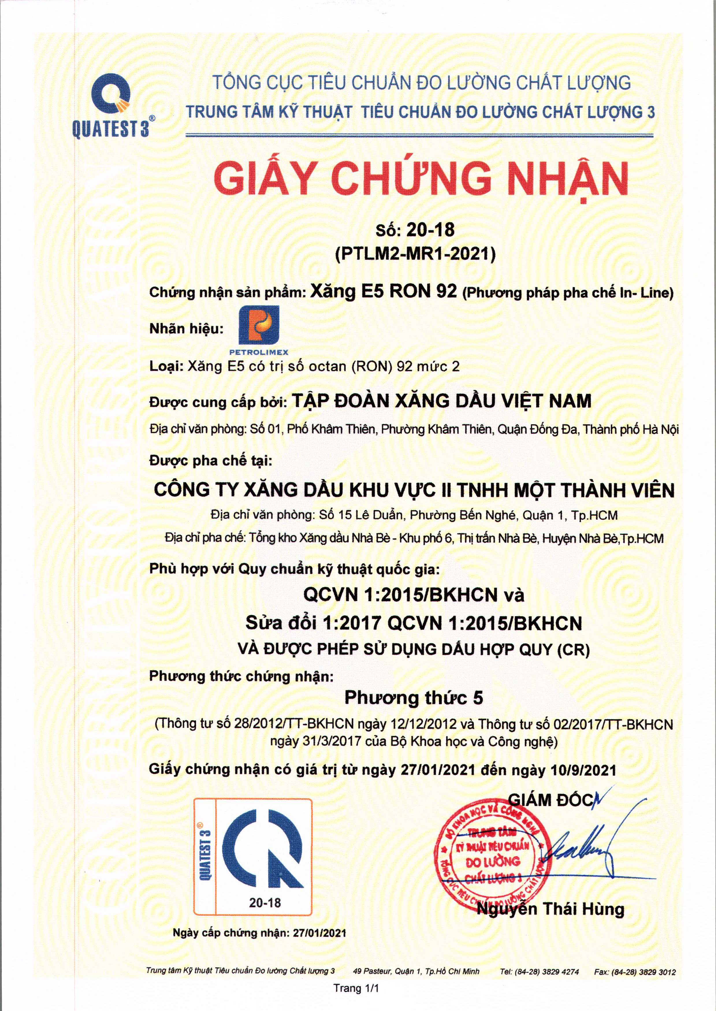 Tháng 9/2025, Trung tâm kỹ thuật tiêu chuẩn đo lường chất lượng 3 (Quatest 3) đánh giá và cấp lại Giấy chứng nhận sản phẩm Xăng E5 RON 92 - II (phương pháp pha chế In-Tank) theo phương thức 5 phù hợp Quy chuẩn kỹ thuật QCVN 01:2022/BKHCN và được phép sử dụng dấu hợp quy (CR), hiệu lực chứng nhận từ ngày 12/9/2025 đến ngày 10/9/2027.