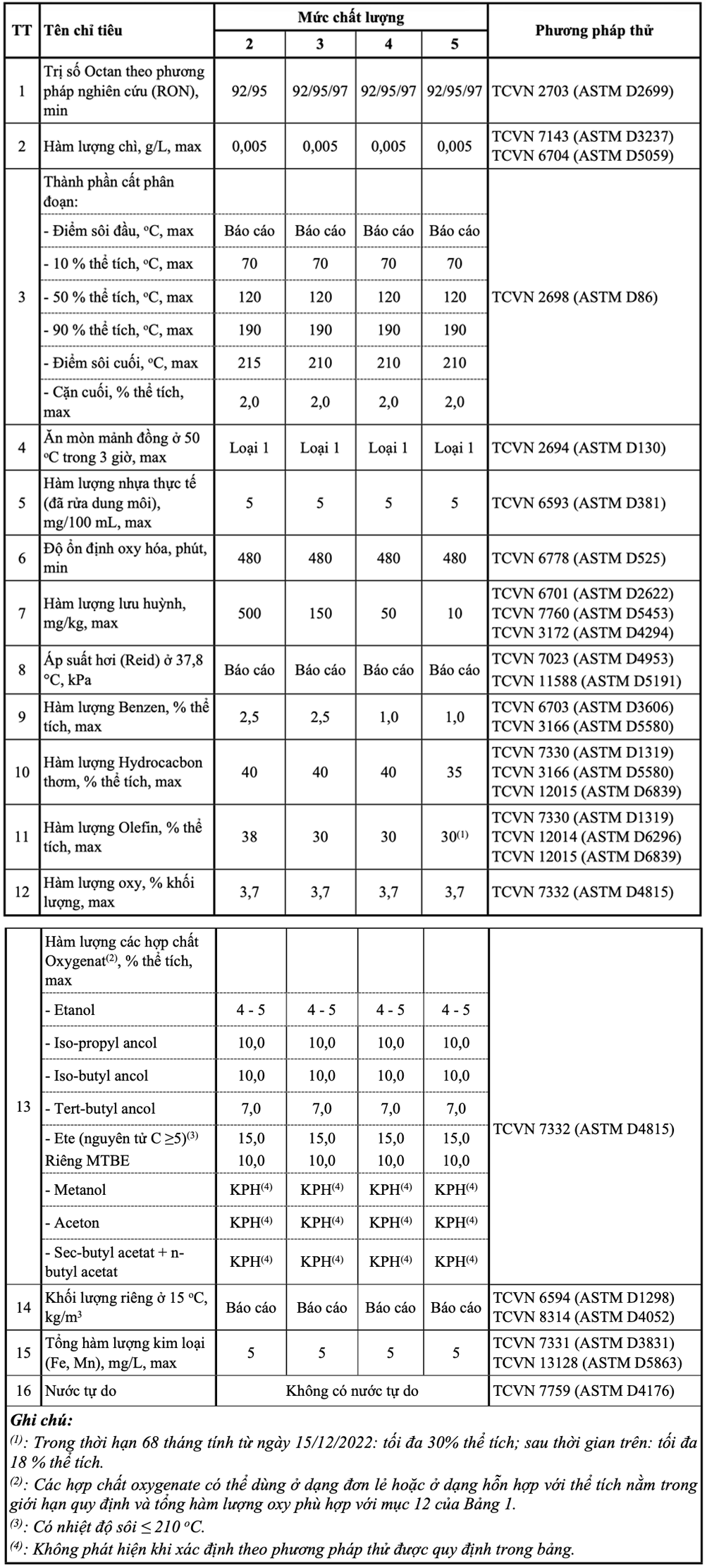 Mức 2, 3, 4 và 5: Là mức chất lượng của xăng E5 phù hợp với QCVN 01:2022/BKHCN Quy chuẩn kỹ thuật Quốc gia về Xăng, nhiên liệu điêzen và nhiên liệu sinh học ban hành theo Thông tư số 16/2022/TT-BKHCN ngày 15/12/2022, và tương ứng với tiêu chuẩn khí thải mức 2, 3, 4 và 5 quy định tại Quyết định số 19/2024/QĐ-TTg ngày 15/11/2024 về việc quy định lộ trình áp dụng mức tiêu chuẩn khí thải đối với xe cơ giới nhập khẩu và sản xuất, lắp ráp.
