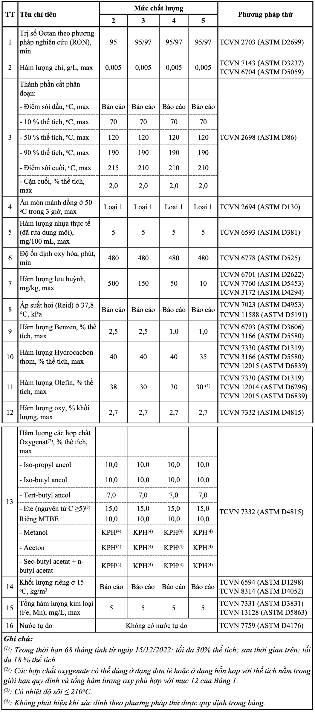 Mức 2, 3, 4 và 5: Là mức chất lượng của xăng không chì phù hợp với QCVN 01:2022/BKHCN Quy chuẩn kỹ thuật Quốc gia về xăng, nhiên liệu điêzen và nhiên liệu sinh học ban hành theo Thông tư số 16/2022/TT-BKHCN ngày 15/12/2022, và tương ứng với tiêu chuẩn khí thải mức 2, 3, 4 và 5 quy định tại Quyết định số 49/2011/QĐ-TTg về việc quy định lộ trình áp dụng tiêu chuẩn khí thải đối với xe ô tô, xe mô tô hai bánh sản xuất, lắp ráp và nhập khẩu mới ban hành ngày 01/9/2011.