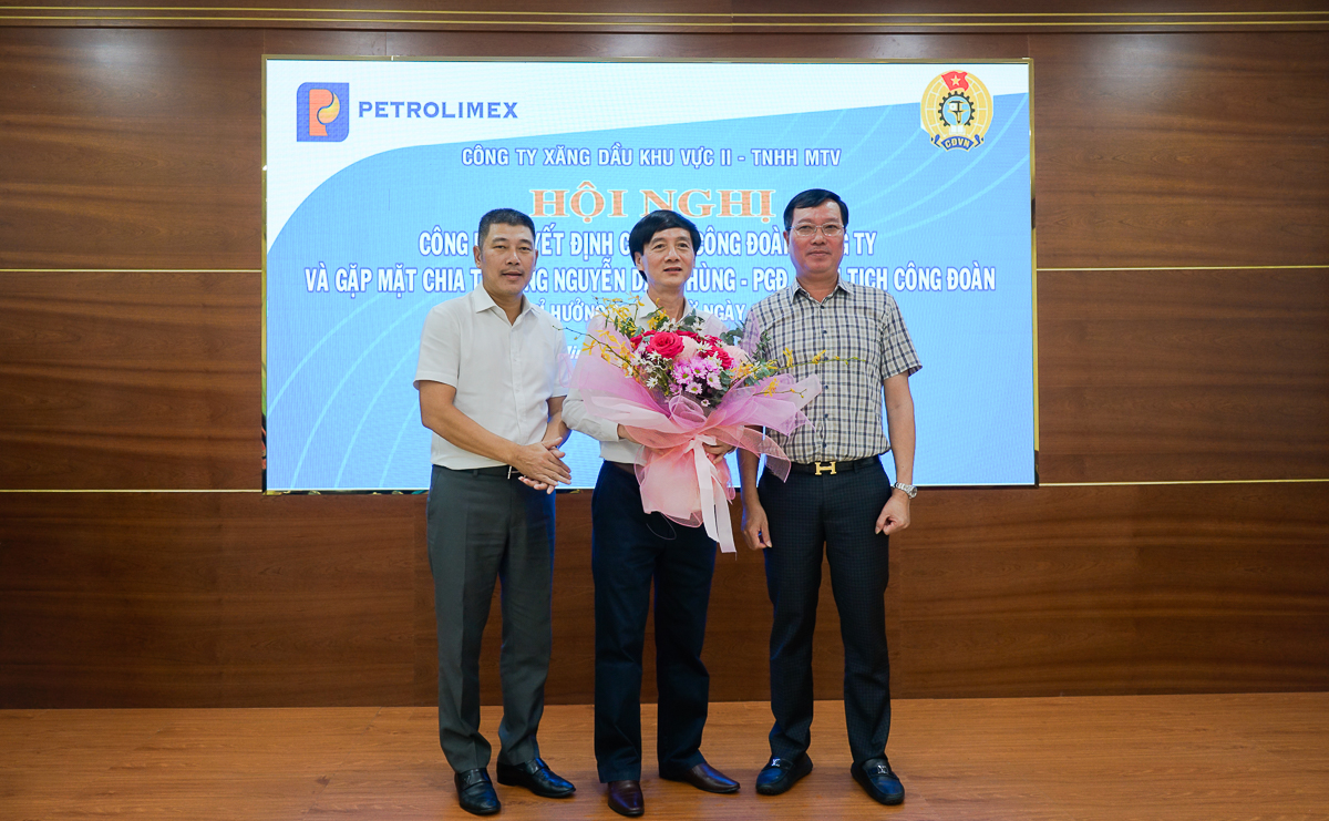 Ông Võ Văn Tân, Bí thư Đảng ủy - Chủ tịch Công ty Xăng dầu Khu vực II (bìa phải) và Phó bí thư Đảng ủy - Giám đốc Công ty Phạm Anh Tuấn (bìa trái) trao tặng hoa chúc mừng Ông Nguyễn Danh Hùng