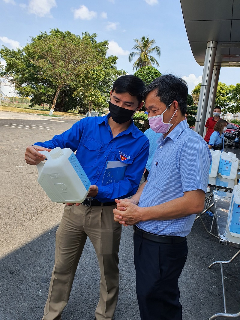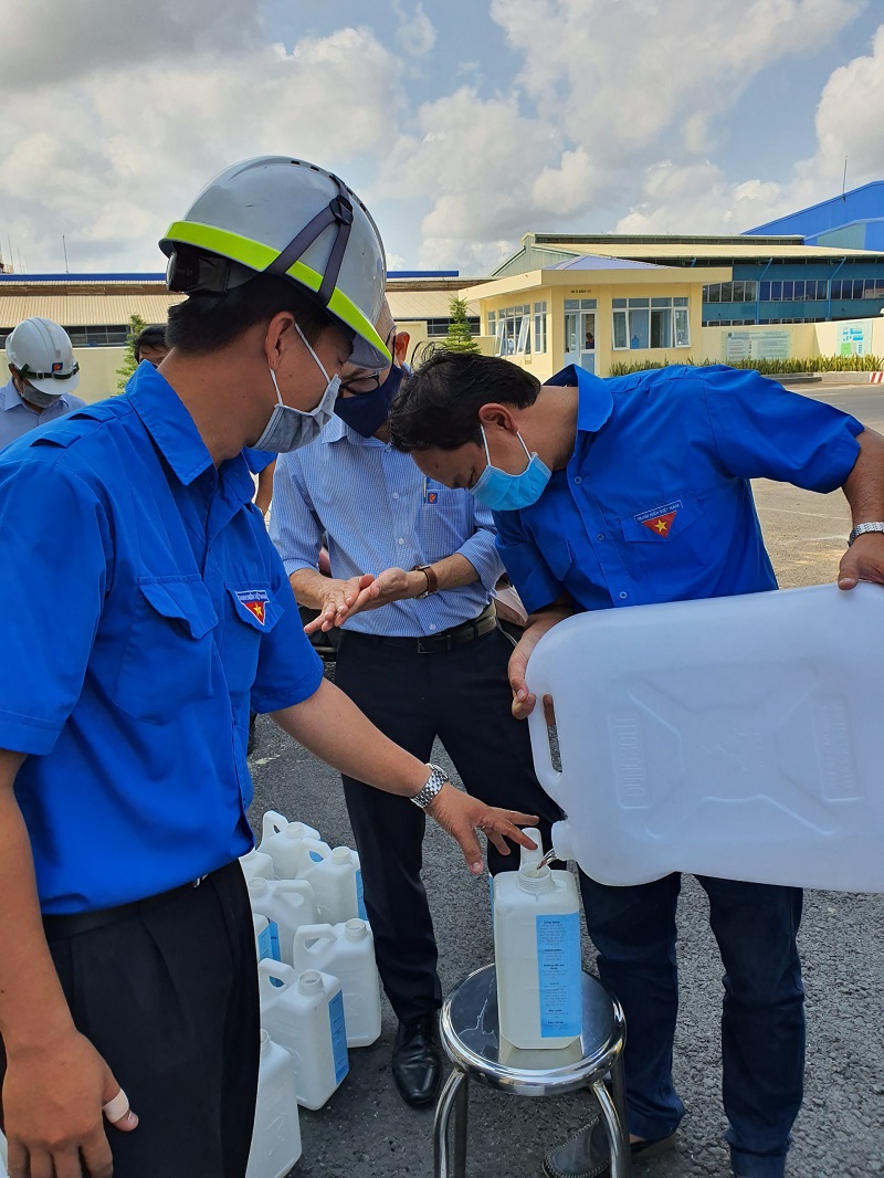 Đoàn thanh niên Tổng kho phối hợp Đoàn thanh niên Công ty cùng các Chi đoàn pha chế cồn sát khuẩn từ nguồn E100