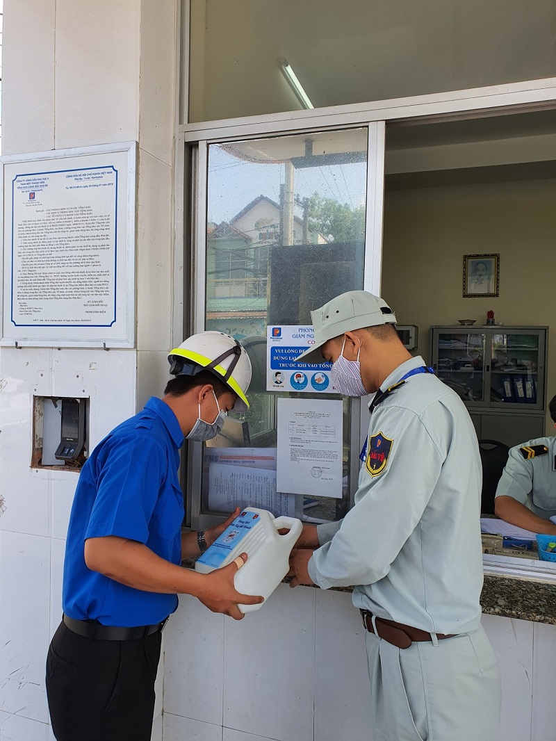 Đo thân nhiệt và phun cồn sát khuẩn, đảm bảo các biện pháp phòng ngừa dịch bệnh từ cổng ra vào Tổng kho
