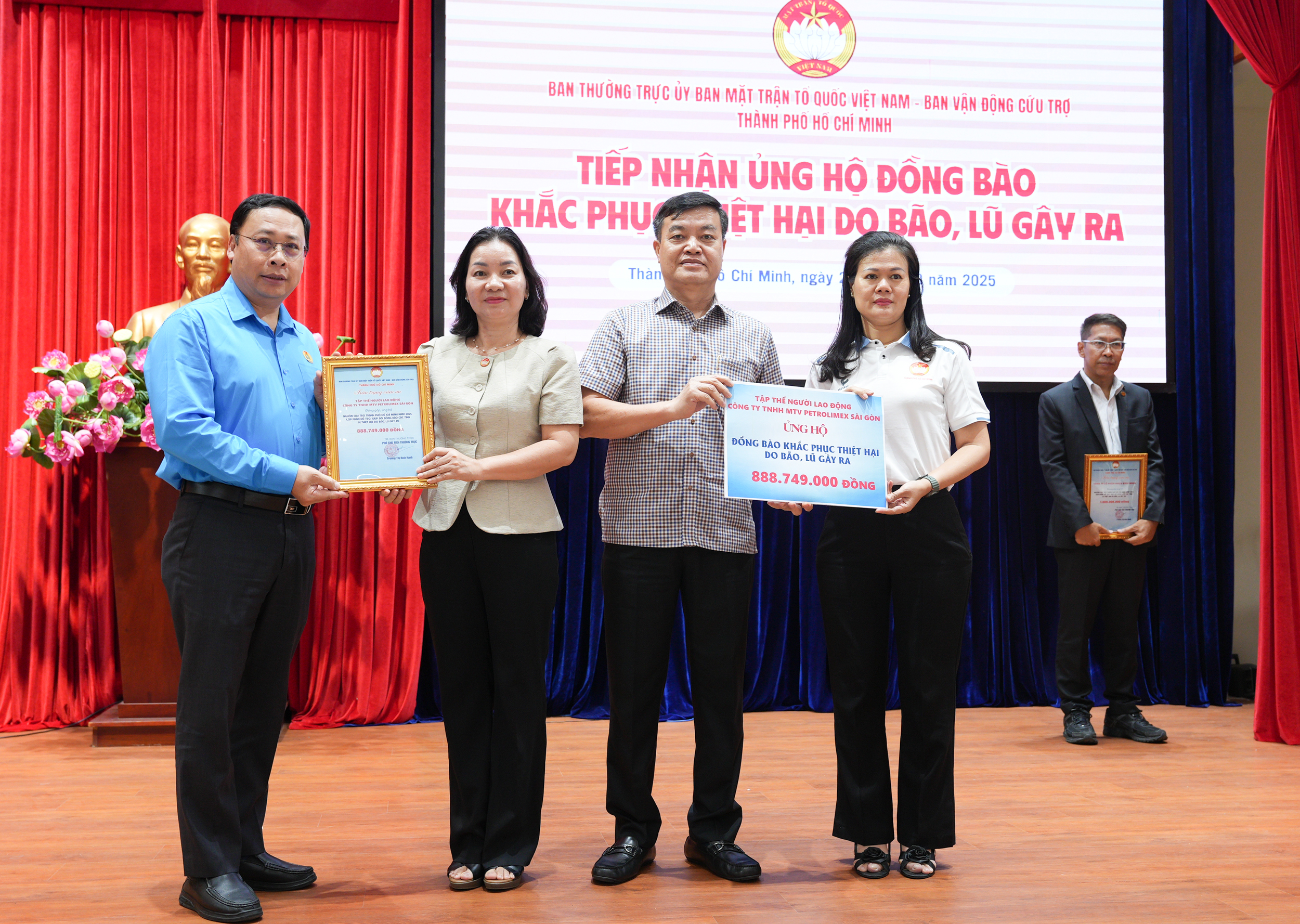 Ngày 23/10/2025, Ủy ban MTTQ Việt Nam TP.HCM tổ chức lễ tiếp nhận hơn 6,4 tỉ đồng cùng các nhu yếu phẩm từ tổ chức, doanh nghiệp và cá nhân để hỗ trợ đồng bào miền Bắc và miền Trung khắc phục hậu quả bão lũ. Người lao động Petrolimex Sài Gòn đã hỗ trợ hơn 888 triệu đồng trong đợt quyên góp này, nâng tổng số tiền đóng góp từ đầu tháng 10 đến nay là hơn 1,1 tỷ đồng.