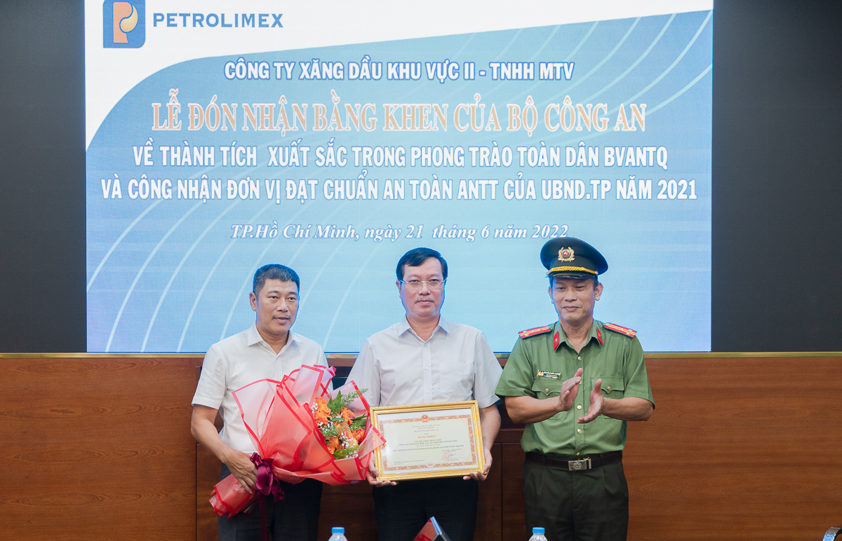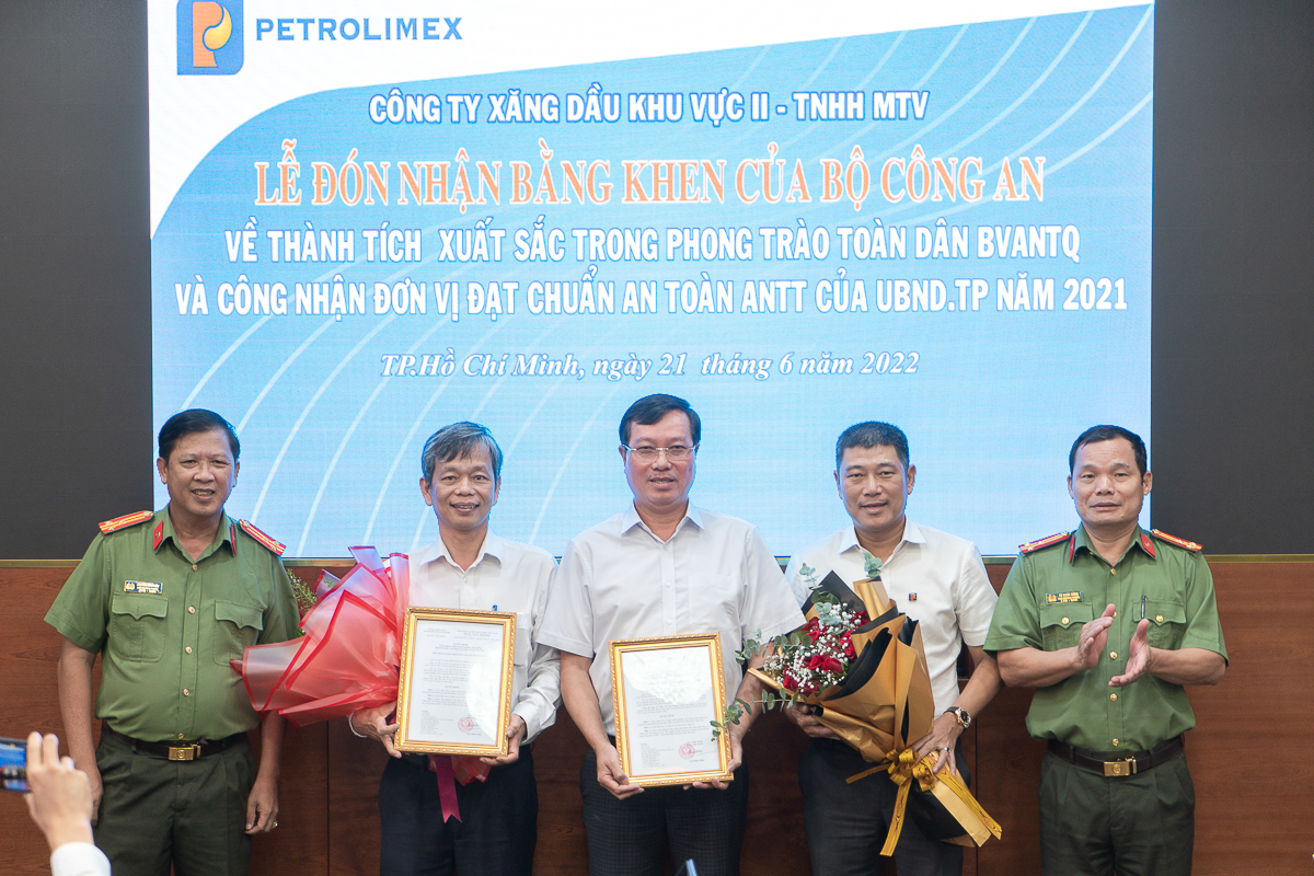 Thượng tá Nguyễn Minh Đức - PTP An ninh Kinh tế Công an TP.HCM (bìa trái) và Thượng tá Tô Quốc Hồng - PTP Công tác Đảng và Công tác chính trị Công an TP.HCM (bìa phải) trao Quyết định của UBND TP.HCM công nhận Công ty Xăng dầu Khu vực II và Tổng kho Xăng dầu Nhà Bè đạt Danh hiệu "Đơn vị an toàn, an ninh, trật tự năm 2021"; Chủ tịch Công ty Võ Văn Tân (giữa), Giám đốc Công ty Phạm Anh Tuấn (thứ hai từ phải sang) và Giám đốc Tổng kho Nhà Bè Bùi Công Minh (thứ hai từ trái sang) nhận Quyết định