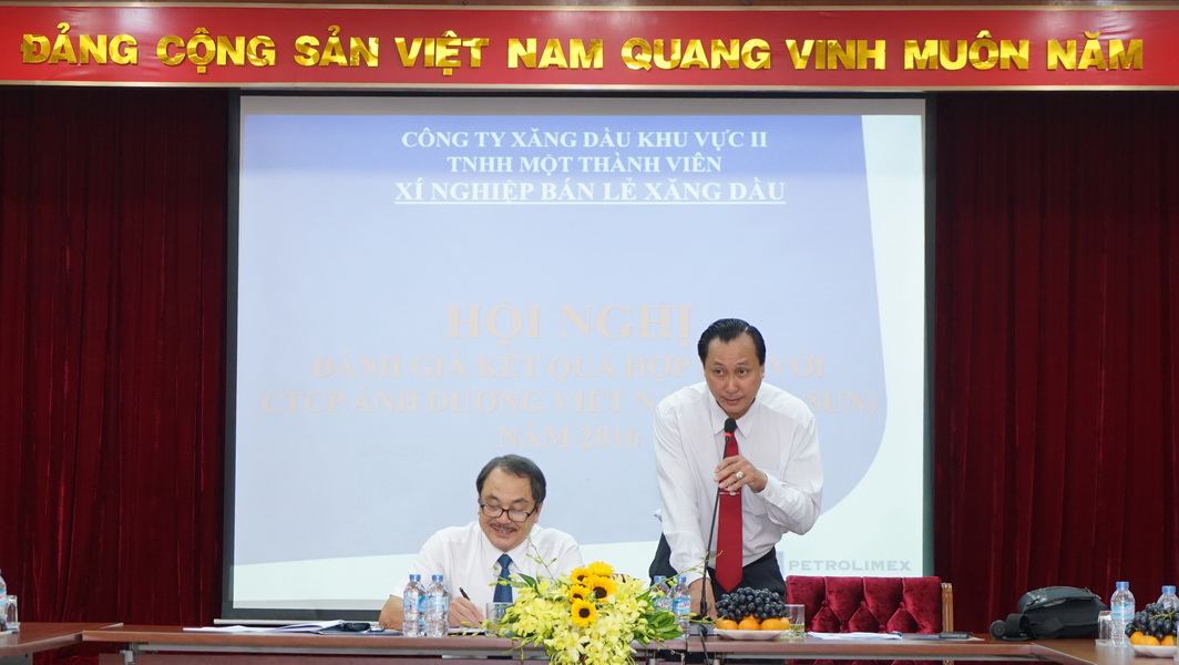 Phó giám đốc XNBL Nguyễn Thanh Hảibáo cáo kết quả hợp tác kinh doanh năm 2016, triển khai kế hoạch 2017 và giới thiệu sản phẩm hàng hóa, dịch vụ của Petrolimex tới khách hàng
