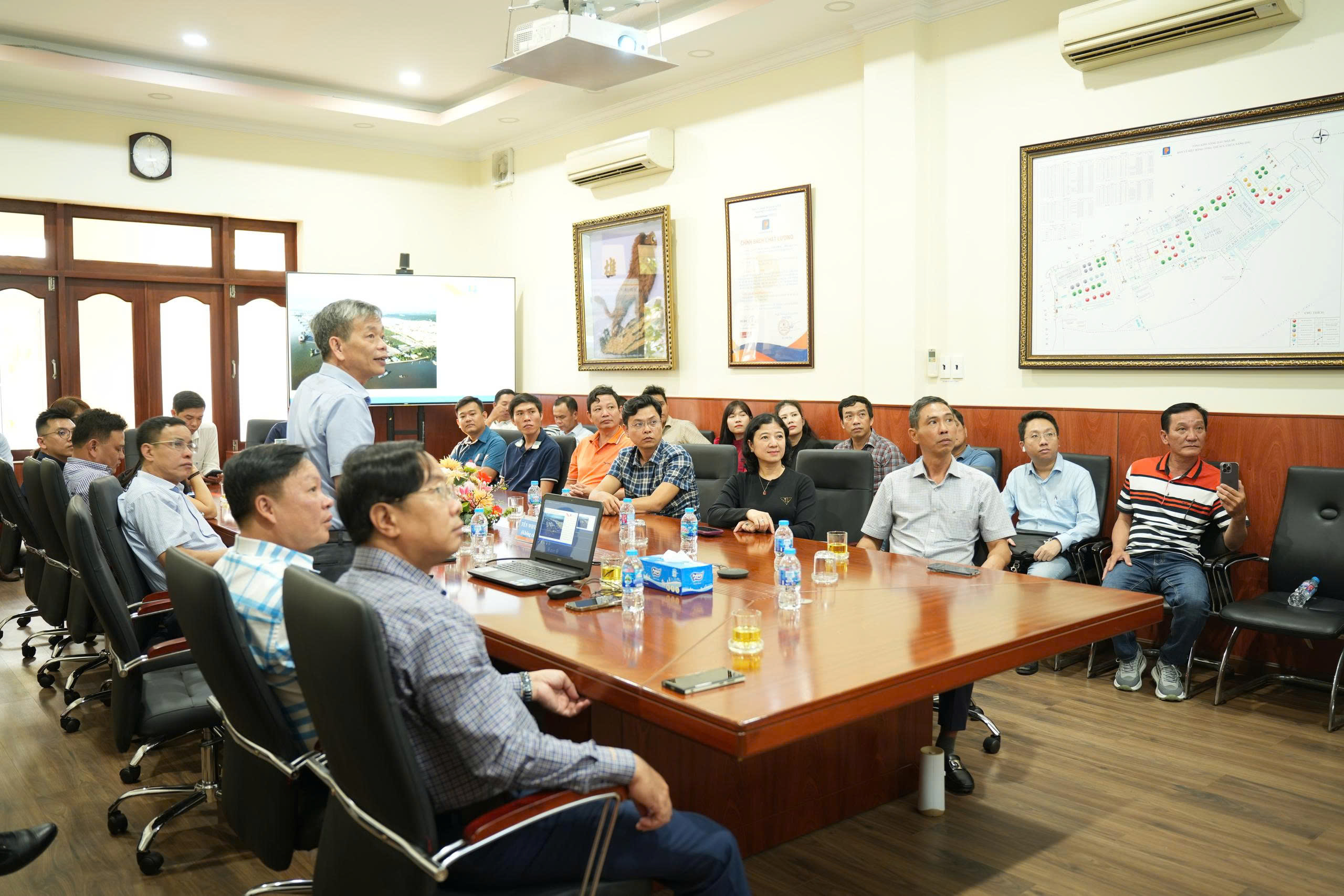 Tại buổi làm việc, Giám đốc TKNB Bùi Công Minh đã trực tiếp giới thiệu tổng quan về hệ thống cơ sở vật chất, dây chuyền công nghệ, quy trình phối trộn xăng sinh học E10, đồng thời chia sẻ kinh nghiệm tổ chức vận hành, kiểm soát chất lượng, đảm bảo an toàn - môi trường trong suốt quá trình tiếp nhận, phối trộn và xuất bán sản phẩm.